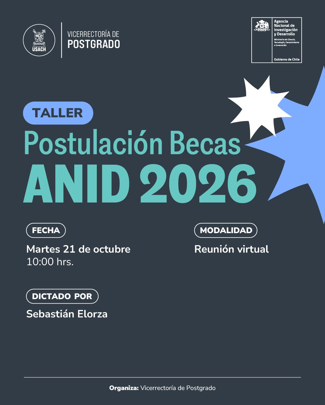La Vicerrectoría de Postgrado de la USACH, en conjunto con ANID, te invita a esta charla donde conocerás todos los detalles sobre los concursos de becas: beneficios, requisitos, plazos y documentos necesarios.