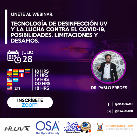 El grupo OSA USACH les invita al seminario web "Tecnología de desinfección UV y la lucha contra el covid-19, posibilidades, limitaciones y desafíos." a realizarse el día 28 de julio a las 18.00 horas.